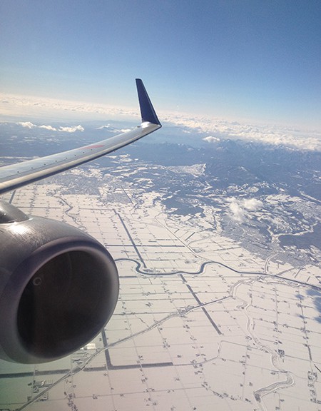 女満別空港は吹雪。1時間半くらい女満別上空を旋回して天候回復を待ったけど、だめ。千歳や旭川など、道内の空港はどこも似たような状況で着陸できず。国内線で5時間近くも機内で過ごしたのは初めてでした。